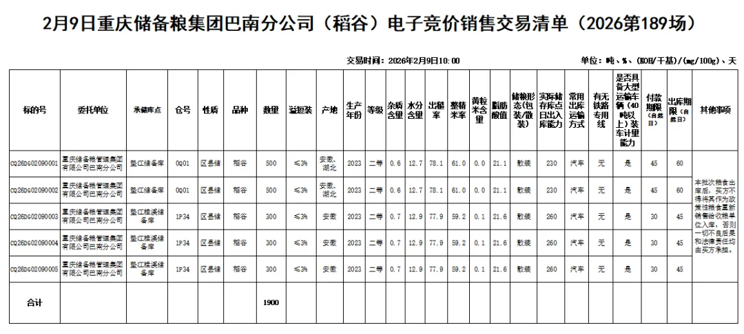 受重庆储备粮管理集团有限公司巴南分公司委托,重庆市粮油批发市场有限责任公司(即国家粮食重庆交易中心,以下简称“批发市场公司”),定于2026年2月9日10:00举办重庆储备粮集团巴南分公司(稻谷)电子竞价销售交易会,现将有关事项公告如下: