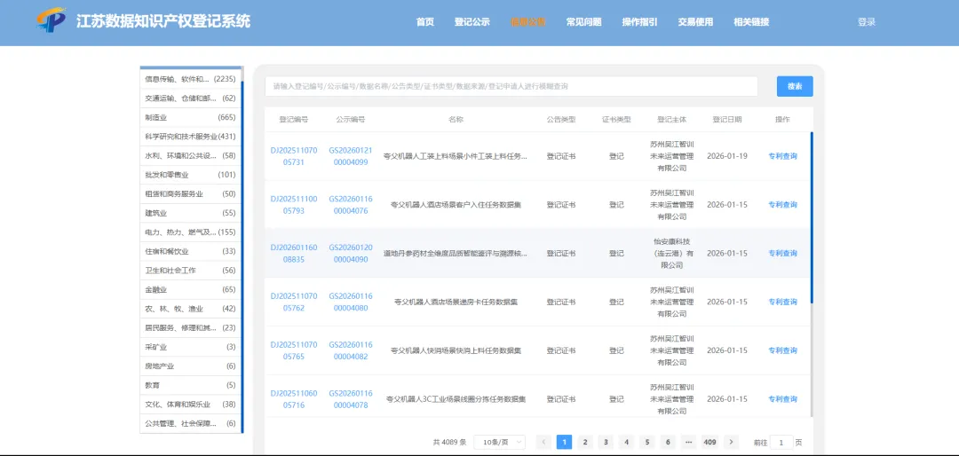 2023年,江苏率先启动数据知识产权登记试点,支持企业将具有独创性、可应用的数据资源进行登记备案,获得法律层面的初步确权。截至2026年2月5日,已有4189项数据集完成登记,覆盖多个重点产业领域。