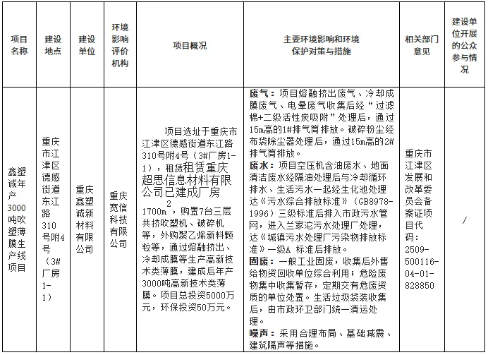鑫塑诚年产3000吨吹塑薄膜生产线项目 | 重庆市江津区德感街道东江路310号附4号(3#厂房1-1) | 重庆鑫塑诚新材料有限公司 | 重庆宽信科技有限公司 | 项目选址于重庆市江津区德感街道东江路310号附4号(3#厂房1-1),租赁租赁重庆超思信息材料有限公司已建成厂房1700m2,购置7台三层共挤吹塑机、破碎机等,外购聚乙烯新料颗粒等,通过熔融挤出、冷却成膜等生产高新技术类薄膜,建成后年产3000吨高新技术类薄膜。项目总投资5000万元,环保投资50万元。 | 废气:项目熔融挤出废气、冷却成膜废气、电晕废气收集后经“过滤棉+二级活性炭吸附”处理后,通过15m高的1#排气筒排放。破碎粉尘经布袋除尘器处理后,通过15m高的2#排气筒排放。 废水:项目空压机含油废水、地面清洁废水经隔油处理后与冷却循环排水、生活污水一起经生化池处理达《污水综合排放标准》(GB8978-1996)三级标准后排入市政污水管网,进入兰家沱污水处理厂处理,达《城镇污水处理厂污染物排放标准》一级A 标准后排放。 固废:一般工业固废,收集后外售给物资回收单位综合利用;危险废物集中收集暂存,定期交有危废资质的单位处置。生活垃圾袋装收集后,由市政环卫部门统一清运处理。 噪声:采用合理布局、基础减震、建筑隔声等措施。 | 重庆市江津区发展和改革委员会备案证项目代码:2509-500116-04-01-828850 | / |