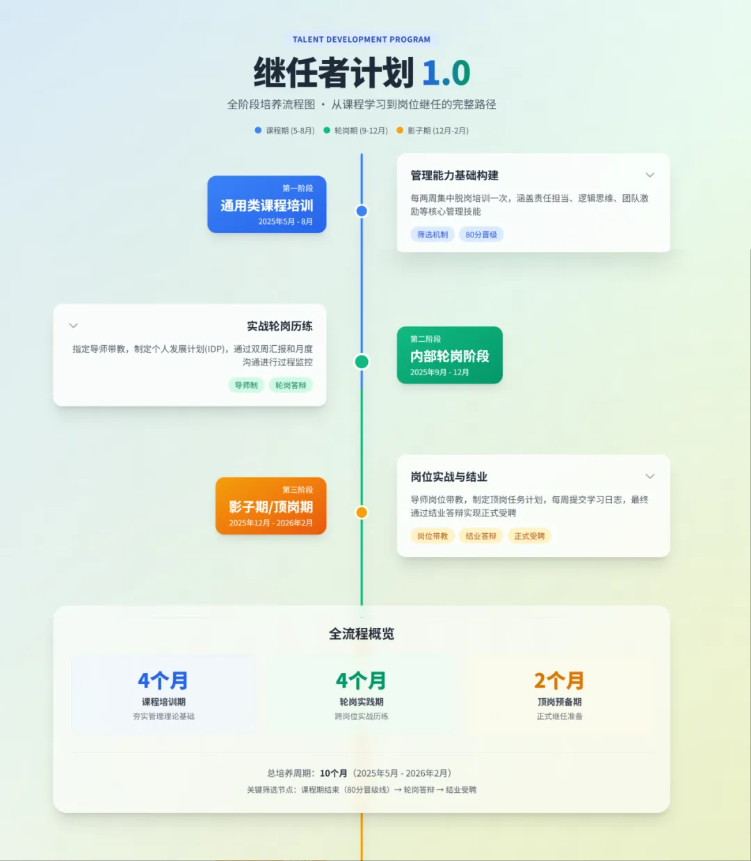 从 “懂理论” 到 “会实操”,从 “能参与” 到 “能独当”,每一个阶段都是一次淬炼,每一次考核都是一次提升,全周期培养只为打造 “拿得出、顶得上、干得好” 的核心继任人才。