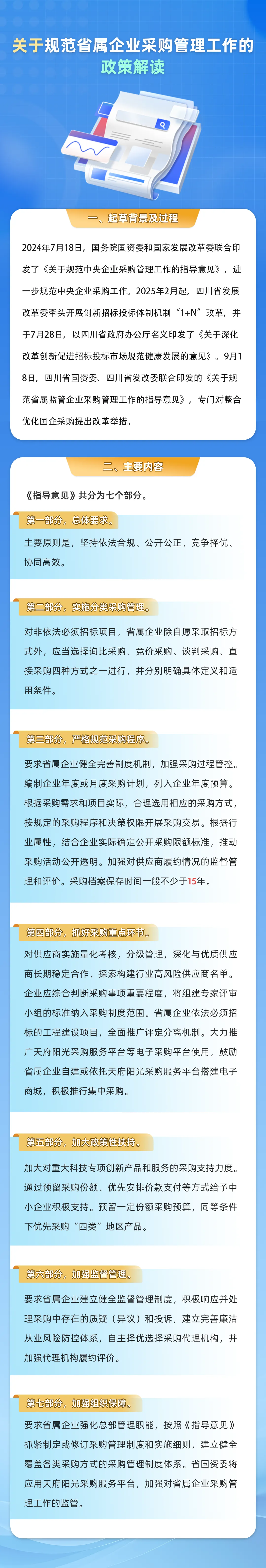 第七部分,加强组织保障。要求省属企业强化总部管理职能,按照《指导意见》抓紧制定或修订采购管理制度和实施细则,建立健全覆盖各类采购方式的采购管理制度体系。省国资委将应用天府阳光采购服务平台,加强对省属企业采购管理工作的监管。