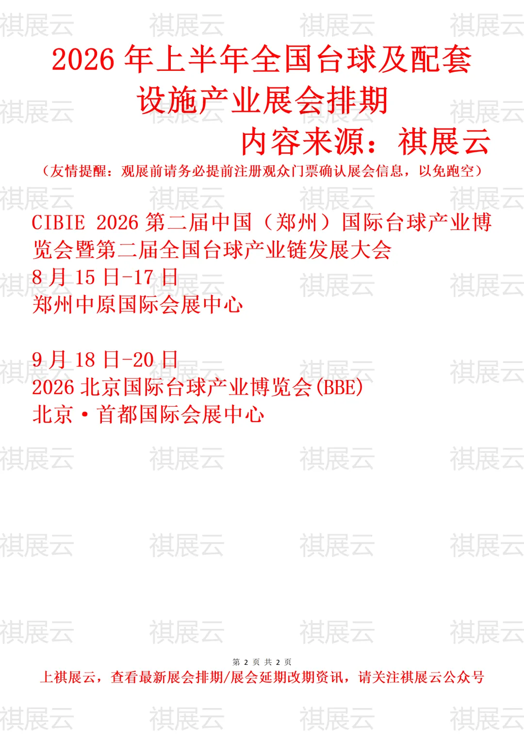 会展资讯丨全国台球展会2026年上半年展会时间表