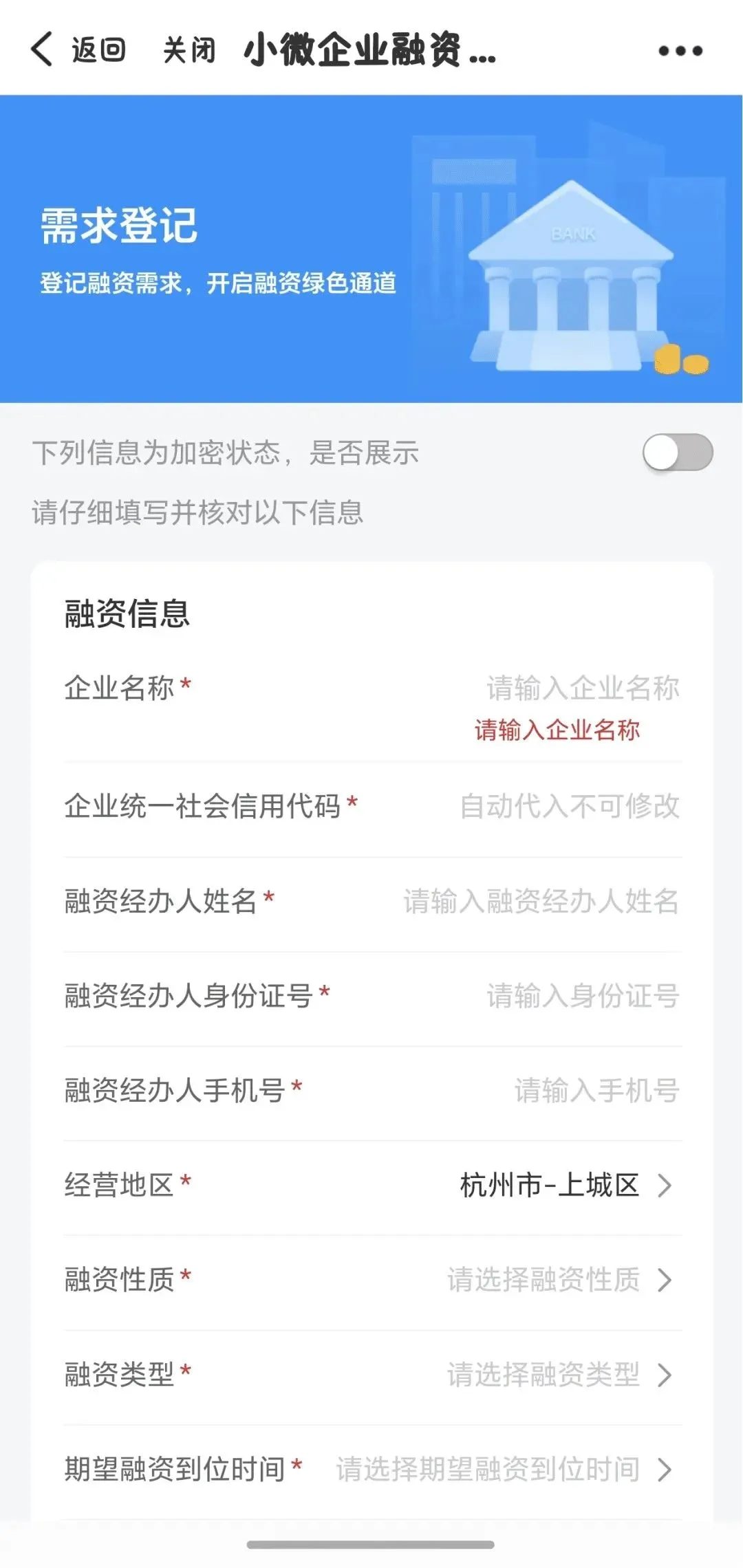 3.从“小微企业融资协调专区”点击“立即申请”进入“需求登记”页面,填写融资需求并提交。