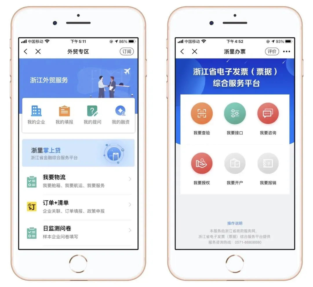 进入“外贸专区”,一键绑定您的企业,享受中小企业咨询服务、FTAX税率查询、融资服务等;“浙里办票”提供发票(票据)查验、存储、下载等服务,充当您的财务小管家。