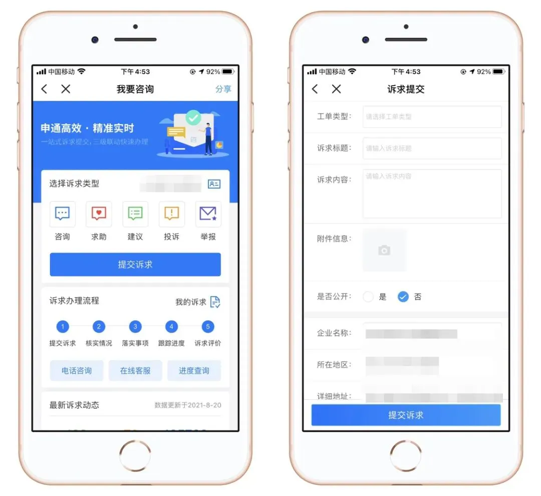 “我要咨询”模块方便企业提出建议、进行满意度评价。只要填写工单类型、诉求标题、诉求内容、附件信息等,选择公开与否,可在线提交诉求。