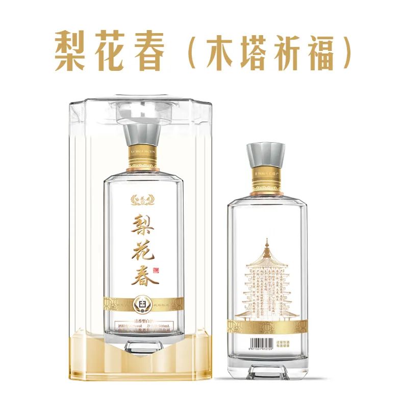 梨花春木塔祈福版以穿越千年的芬芳致敬应县木塔风姿,透过清澈的酒液将塔体巧妙放大,栩栩如生,通过时尚现代的方式将梨花春酒的历史和文化内涵展示给世人,演绎和传播了清香美酒与中华传统文化的永恒魅力。