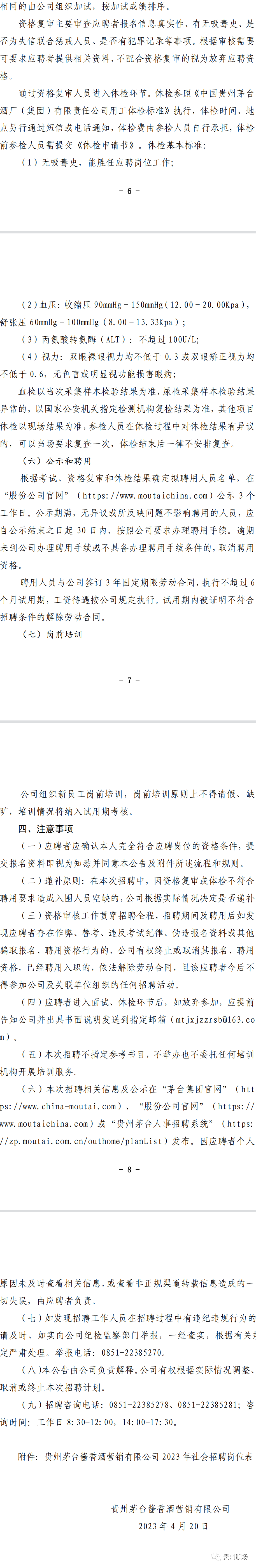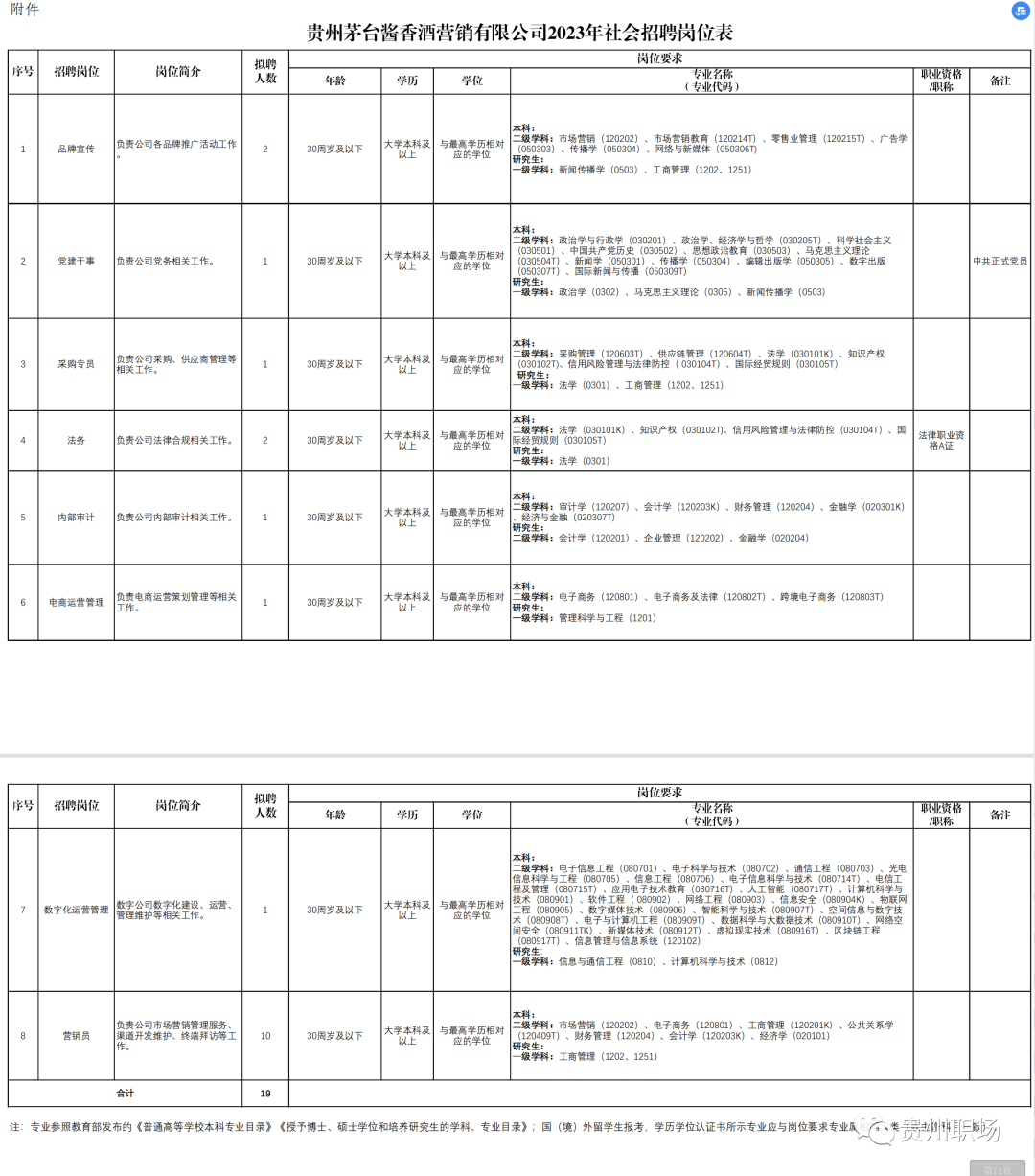 贵州茅台酱香酒营销有限公司 2023 年社会招聘岗位19人!
