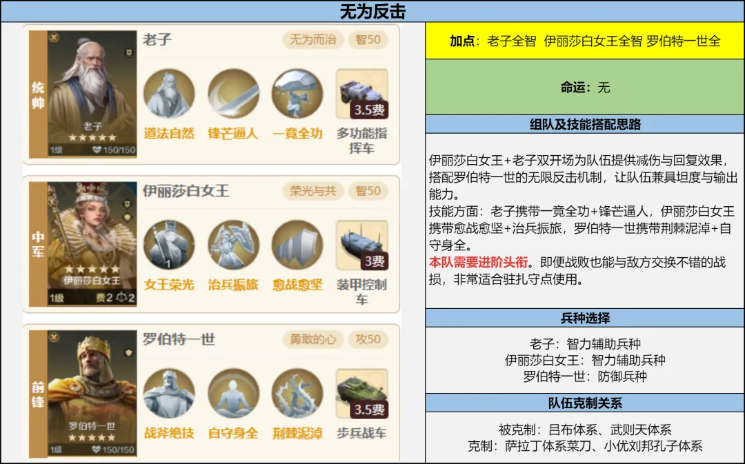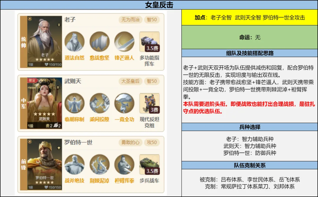 2. 可适配慢速追击体系,能搭配武则天、伊丽莎白一世、老子、孙武一系列慢速辅助。驻守能力极强,平民队的驻守卡点强力队伍,有效遏制高氪多穿队伍发挥。
