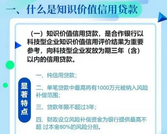 知识价值信用贷款,是合作银行以科技型企业知识价值信用评价结果为重要参考,向科技型企业发放为期三年(含)以内的信用贷款,核心特点如下: