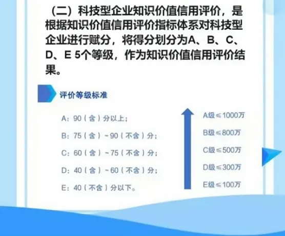 科技型企业知识价值信用评价,通过“知识价值信用评价指标体系”赋分,划分为A、B、C、D、E五个等级,对应最高贷款额度1000万、800万、500万、300万、100万。