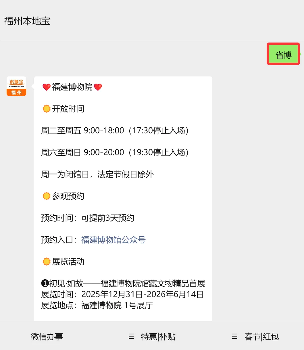 在微信对话框回复【省博】