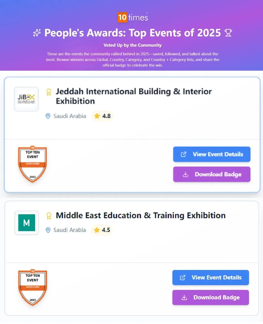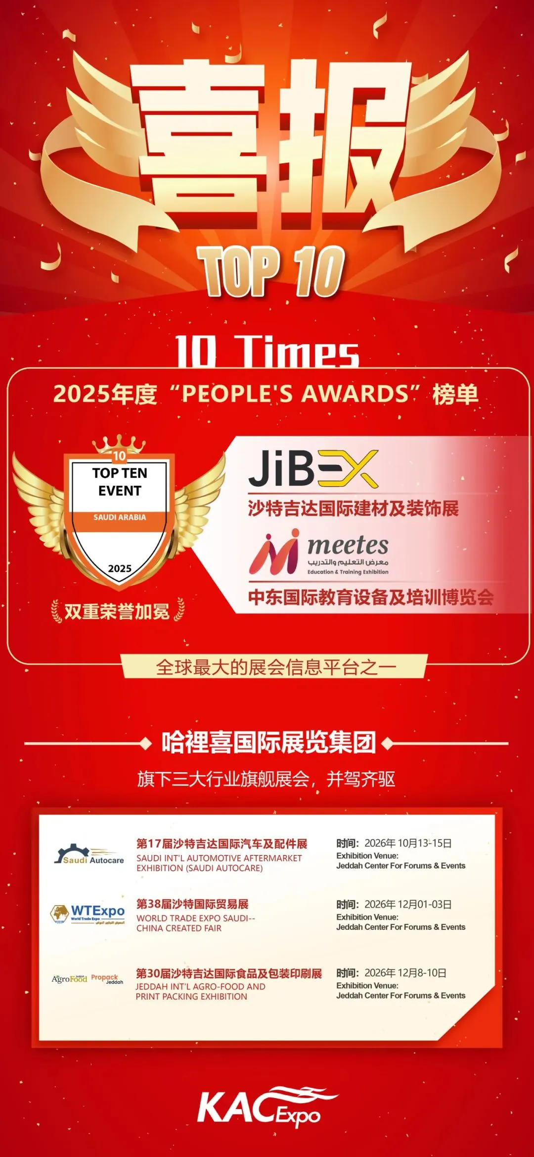 近日,全球领先的展会信息平台10 Times正式揭晓2025年度“People's Awards”榜单。我司主办的沙特吉达国际建材及装饰展(Jibex)与中东国际教育设备及培训展览会(Meetes),凭借卓越的行业影响力与商业群体高度认可,双双荣膺全球前十顶尖评级!