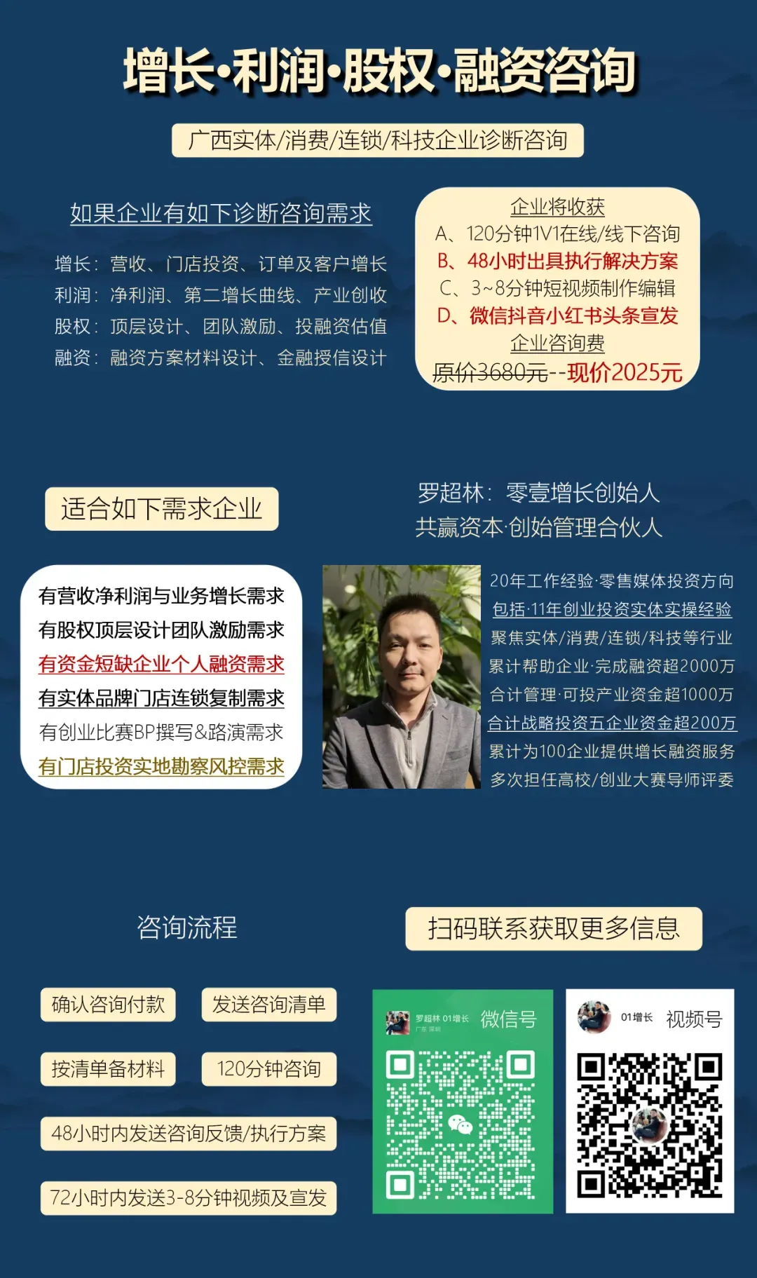 2015-2025年间为上百家广西新经济新消费及实体企业,提供私募股权融资、商业模式设计、(基于融资的)商业计划书撰写、股权设计等服务。2023年开始,组建了16个投后服务团队(囊括品牌、市场、财税、信息、IP流量、法务、金融等),累计帮助企业完成融资额2000多万元,担任贰只CVC的执行GP(合计管理资金壹千万元);期间还多次参与国家级、广西及各地市创业大赛评委、担任广西各高校指导老师。希望可帮助企业实现3年5-10倍的爆发式增长,帮助大学生在创业大赛过程中取得优异名次。