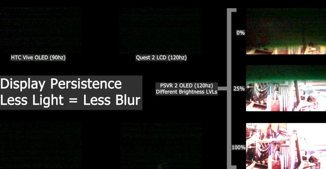 这一问题来源于业内知名XR博主在本月4日发布的一则视频。该博主发现,即使在亮度调至0%(即亮度最低)的情况下,PSVR2似乎也是所有VR头显中高显示持久性最高的显示器,而这其中排名第二的是Quest Pro。