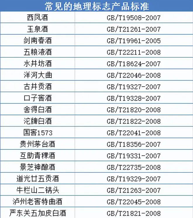 比如我们熟知的贵州茅台(GB/T18356)、五粮液(GB/T22211)就是地理标志性产品执行标准,与之相同的还有国窖1573(GB/T22041)、剑南春(GB/T19961)等等也是该标准。