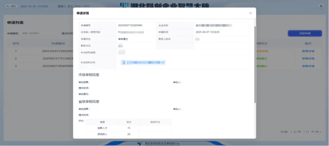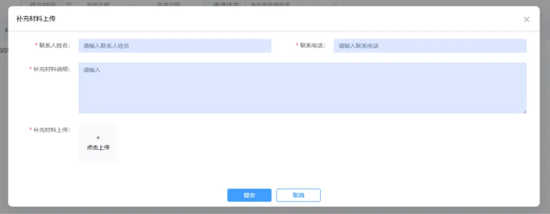 在企业中心点击补充材料更新评级按钮,打开申请列表页面,点击发起申请按钮,填写联系人姓名、联系电话、补充材料说明,并上传补充材料,点击提交按钮,等待审核人员进行审核,可查看申请详情。审核通过后获得新评级。