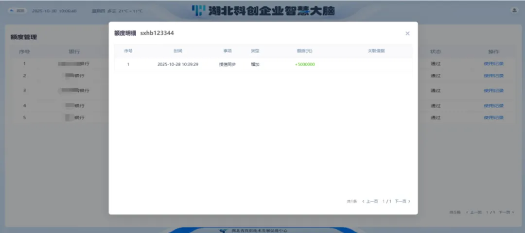 在企业中心-特色服务栏目,点击知识价值信用贷图标,选择额度管理,会打开额度管理列表页面,可查看额度管理信息,包括贷款银行、授信编号、授信额度、授信起始时间、授信截止时间、授信状态等,还可查看额度使用明细。