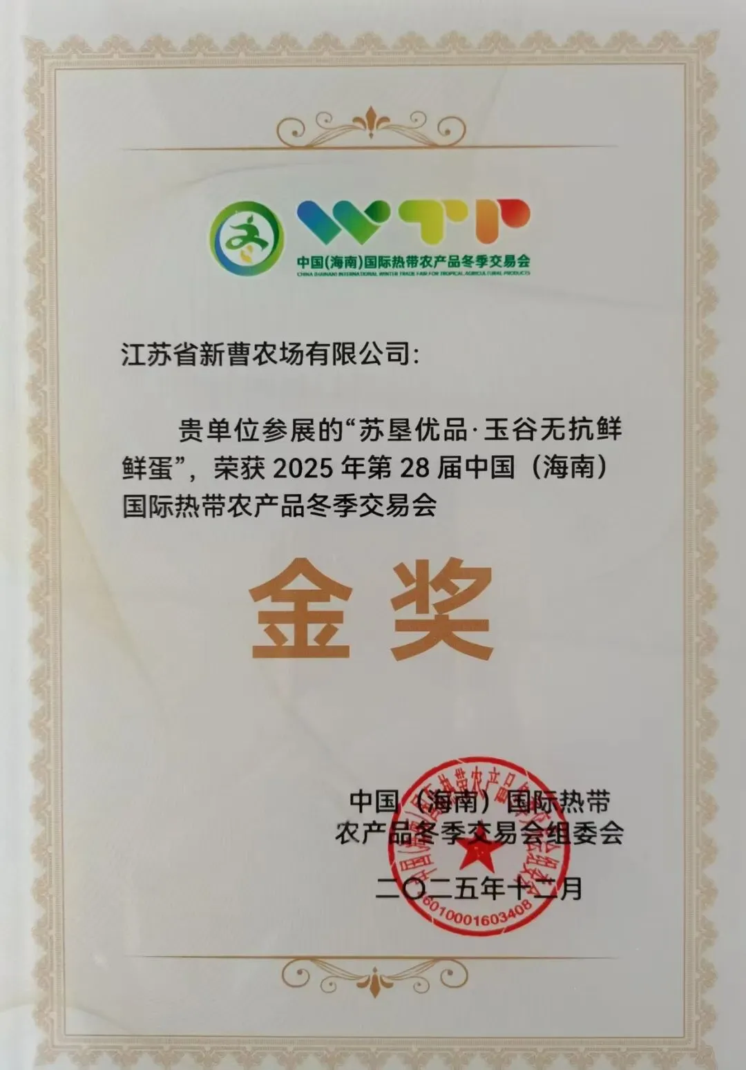 在前不久圆满落幕的第28届中国(海南)国际热带农产品冬季交易会上,江苏农垦旗下新曹农场选送的“苏垦优品·玉谷无抗鲜鲜蛋”凭借过硬的产品品质、鲜明的生态特色,成功斩获展会金奖。