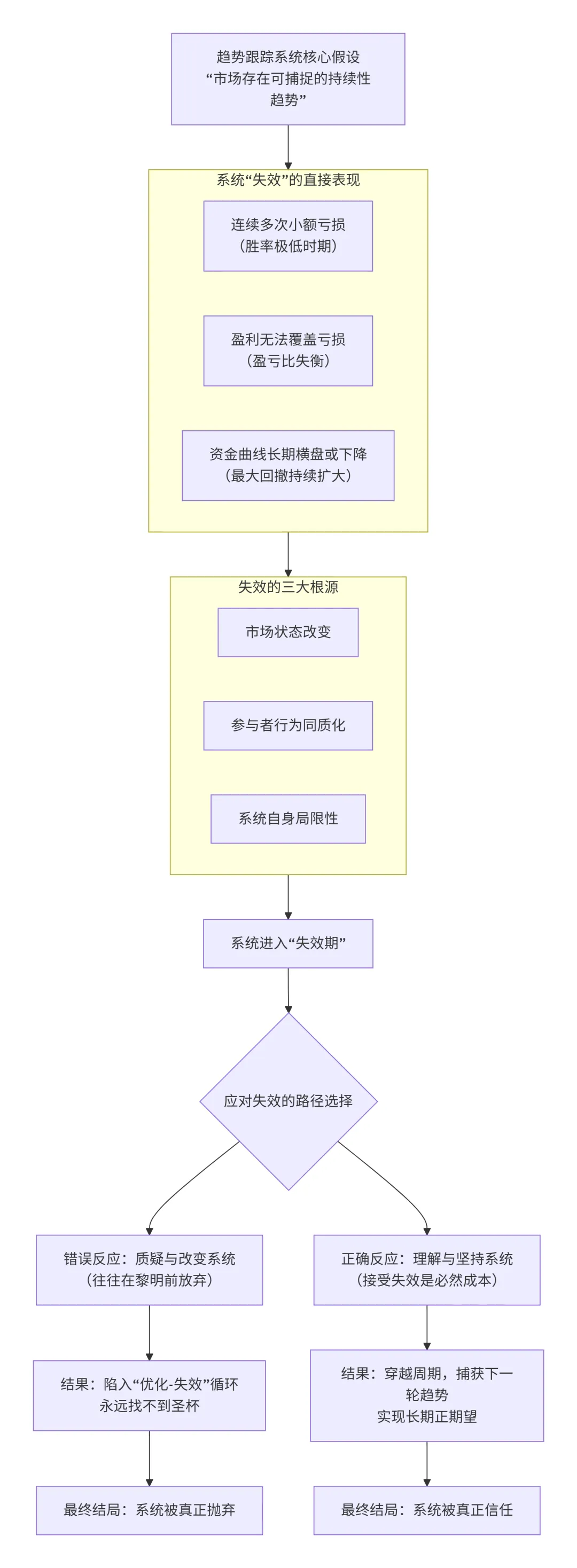 系统的“失效”不是指永久损坏,而是指其赖以生存的“土壤”(趋势性市场)暂时消失了。下图系统性地揭示了其失效的深层逻辑与循环: