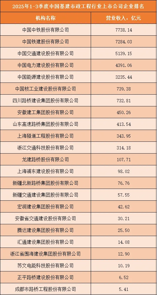 根据申万行业分类,2025年1-3季度中国基建市政工程行业上市公司按营业收入排名如下:(A股上市公司)