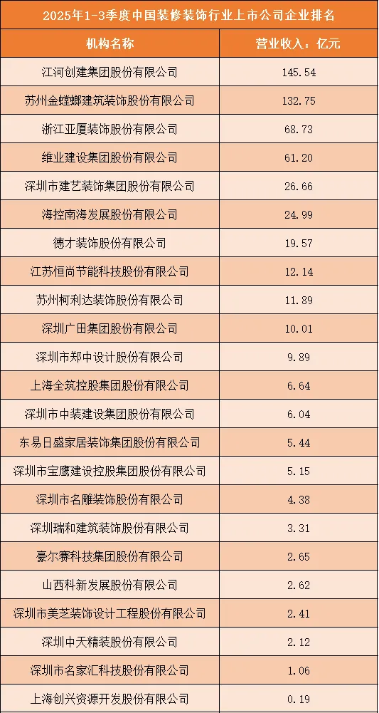 一、2025年1-3季度中国装修装饰行业上市公司企业排名分析