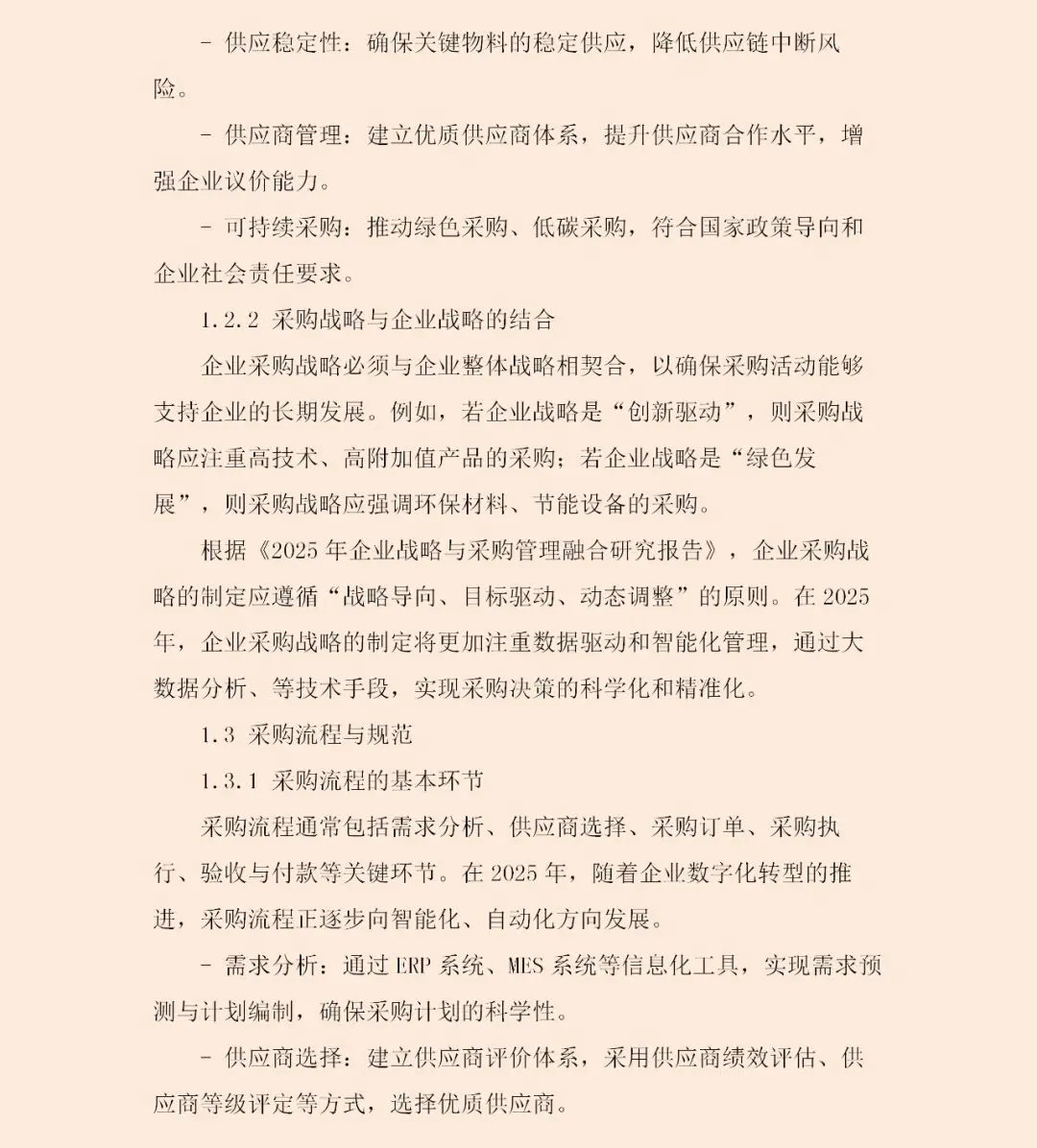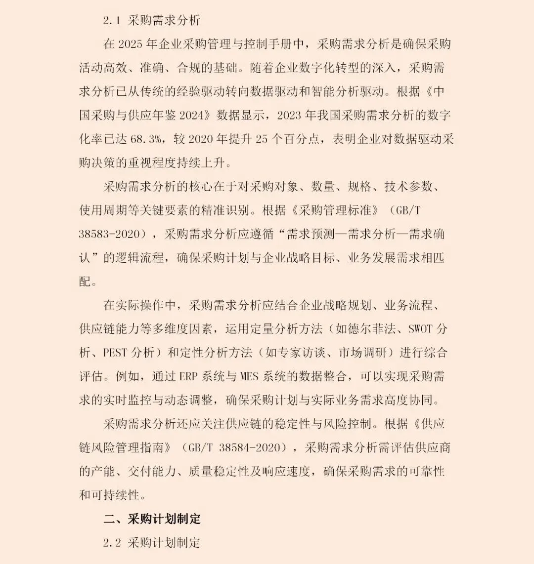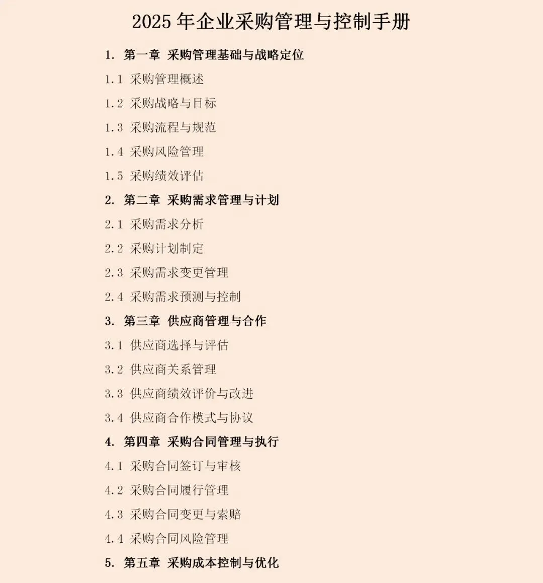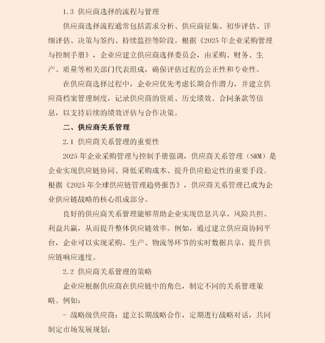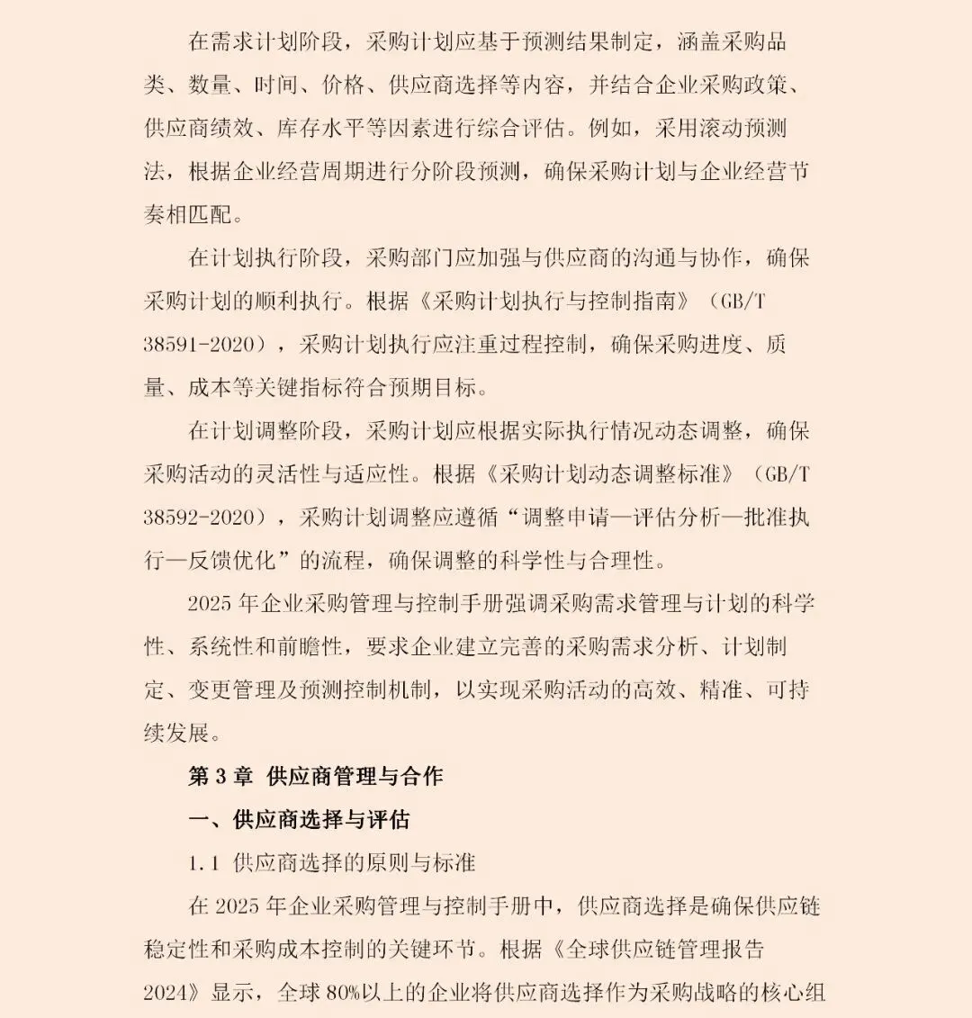 这份《2025年企业采购管理与控制手册》揭示了一个清晰趋势:采购管理正全面转向“战略驱动型”。这意味着,采购活动必须与企业整体战略紧密咬合——若企业追求创新,采购需侧重高附加值技术与材料;若锚定绿色低碳,则供应链的可持续性成为筛选供应商的首要标准。