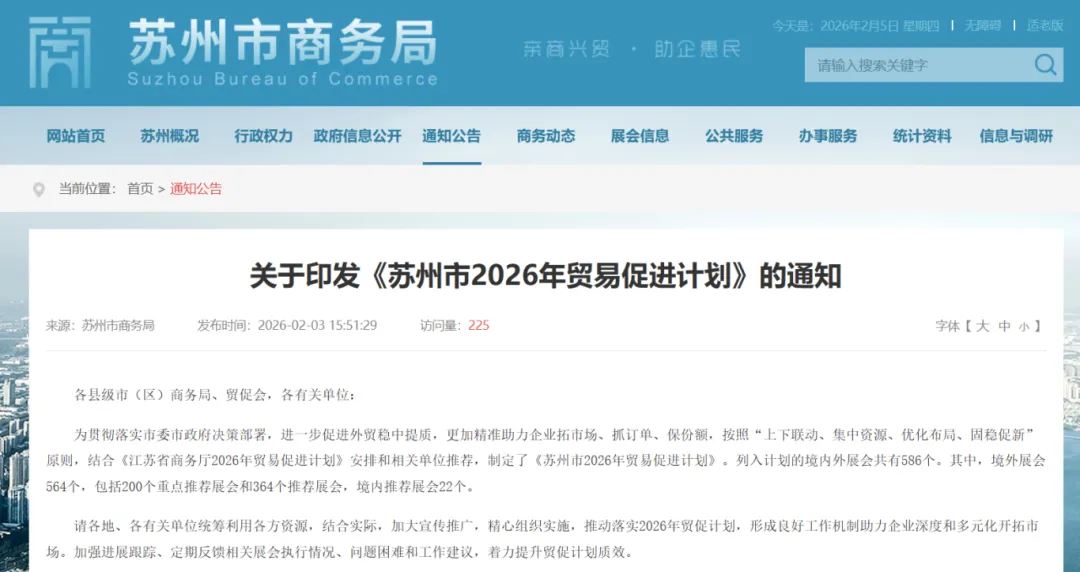 结合《江苏省商务厅2026年贸易促进计划》安排和相关单位推荐,制定了《苏州市2026年贸易促进计划》。列入计划的境内外展会共有586个。其中,境外展会564个,包括200个重点推荐展会和364个推荐展会,境内推荐展会22个。