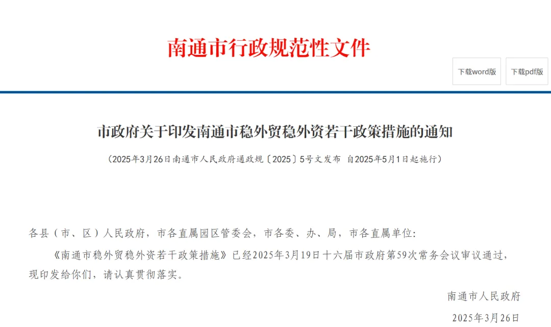 《市政府关于印发南通市稳外贸稳外资若干政策措施的通知》,2025年发布,2026 年继续执行。