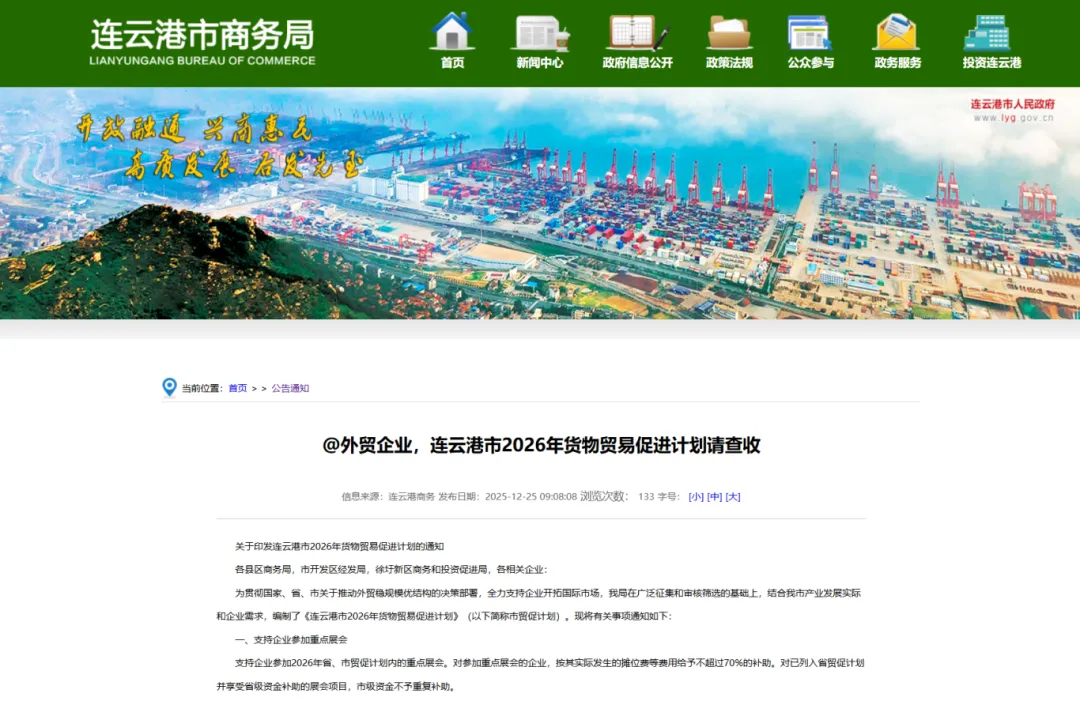 《连云港市2026年货物贸易促进计划》中的重点展会名录涵盖十一大类、超150场境内外展会