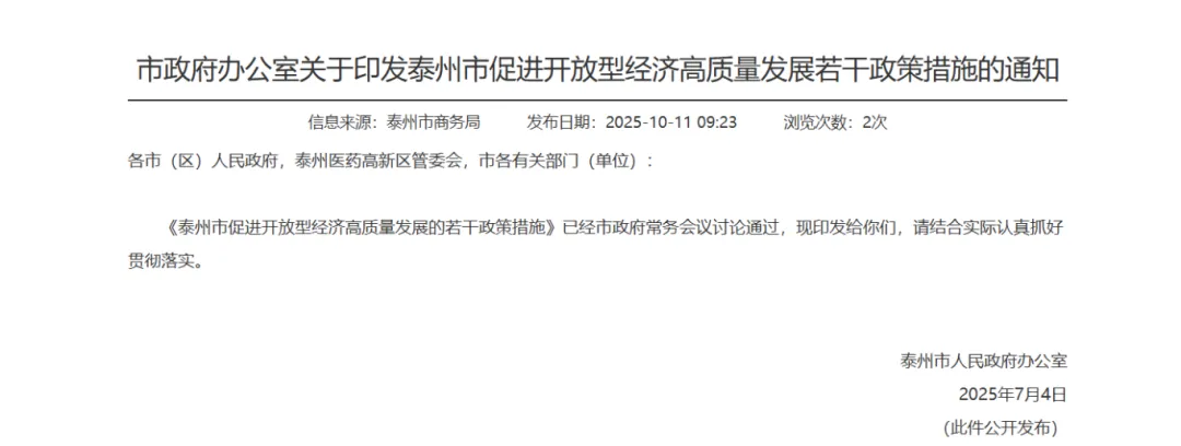泰州市 2026 年未发布全新专项政策文件,而是延续执行 2025 年 7 月发布的核心政策并同步衔接江苏省 2026 年贸易促进计划;2026 年第一批申报工作预计于上半年启动,目前可按现行政策标准提前准备材料。