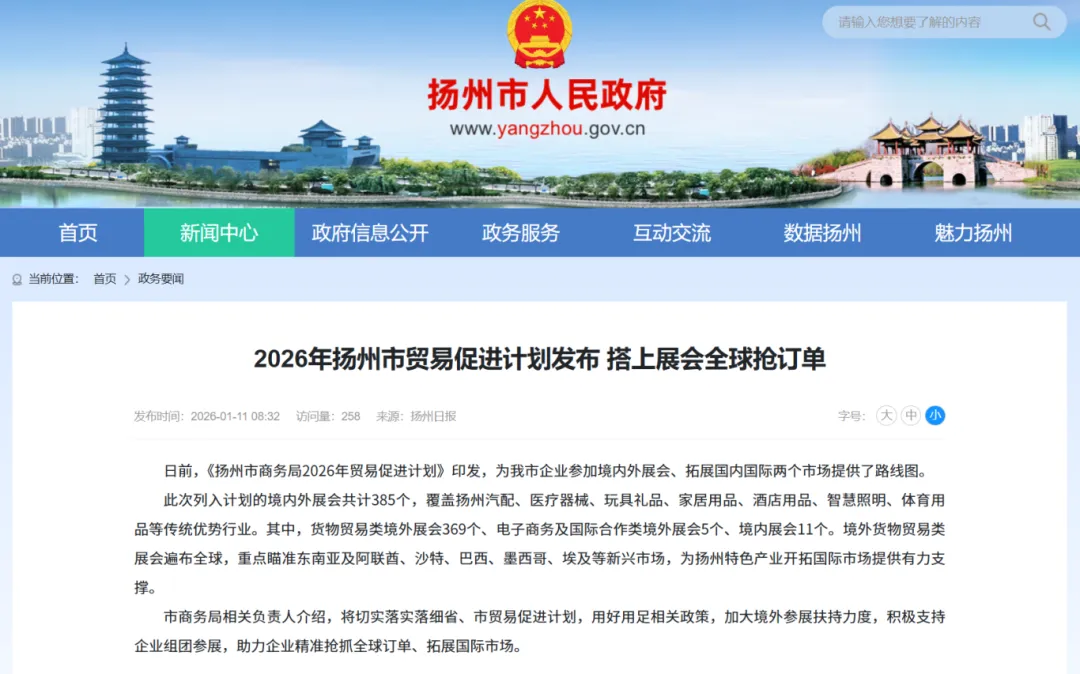 《扬州市商务局2026年贸易促进计划》印发,此次列入计划的境内外展会共计385个,覆盖扬州汽配、医疗器械、玩具礼品、家居用品、酒店用品、智慧照明、体育用品等传统优势行业。其中,货物贸易类境外展会369个、电子商务及国际合作类境外展会5个、境内展会11个。境外货物贸易类展会遍布全球,重点瞄准东南亚及阿联酋、沙特、巴西、墨西哥、埃及等新兴市场,为扬州特色产业开拓国际市场提供有力支撑。