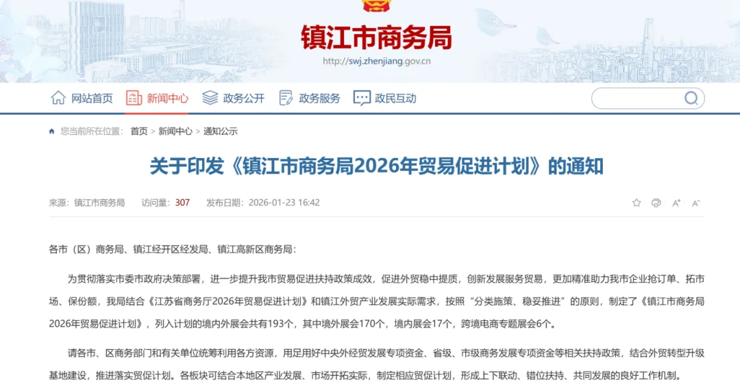 结合《江苏省商务厅2026年贸易促进计划》和镇江外贸产业发展实际需求,按照“分类施策、稳妥推进”的原则,制定了《镇江市商务局2026年贸易促进计划》,列入计划的境内外展会共有193个,其中境外展会170个,境内展会17个,跨境电商专题展会6个。