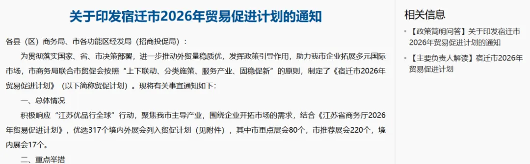 积极响应“江苏优品行全球”行动,聚焦我市主导产业,围绕企业开拓市场的需求,结合《江苏省商务厅2026年贸易促进计划》,优选317个境内外展会列入贸促计划,其中市重点展会80个,市推荐展会220个,境内展会17个。