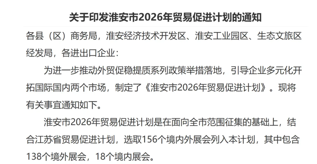 淮安市2026年贸易促进计划是在面向全市范围征集的基础上,结合江苏省贸易促进计划,选取156个境内外展会列入本计划,其中包含138个境外展会,18个境内展会。