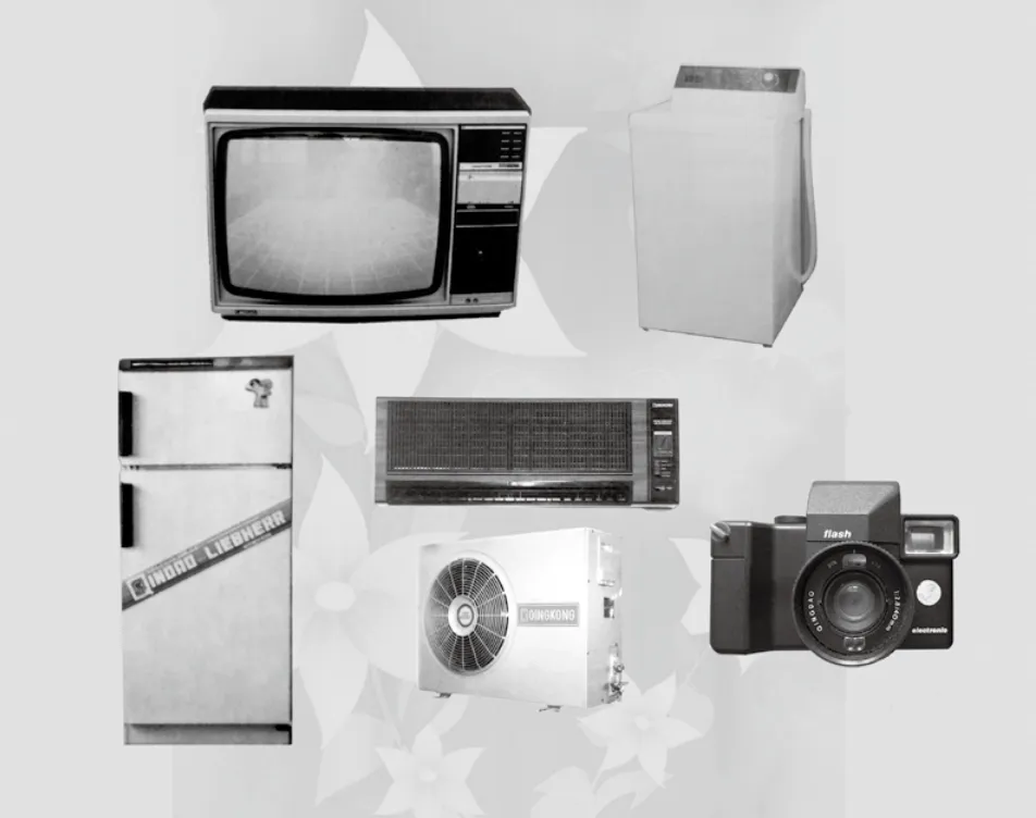 ■20世纪90年代初期青岛家电业的“五朵金花”:“青岛”牌SR5108彩色电视机、琴岛XPB36-3S双桶洗衣机、琴岛—利勃海尔BCD220型电冰箱、“青空”牌KFR-50GW分体式房间空调器、“青岛”牌青岛6型135自动曝光照相机
