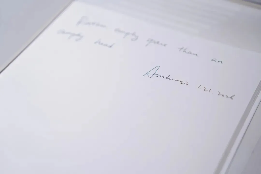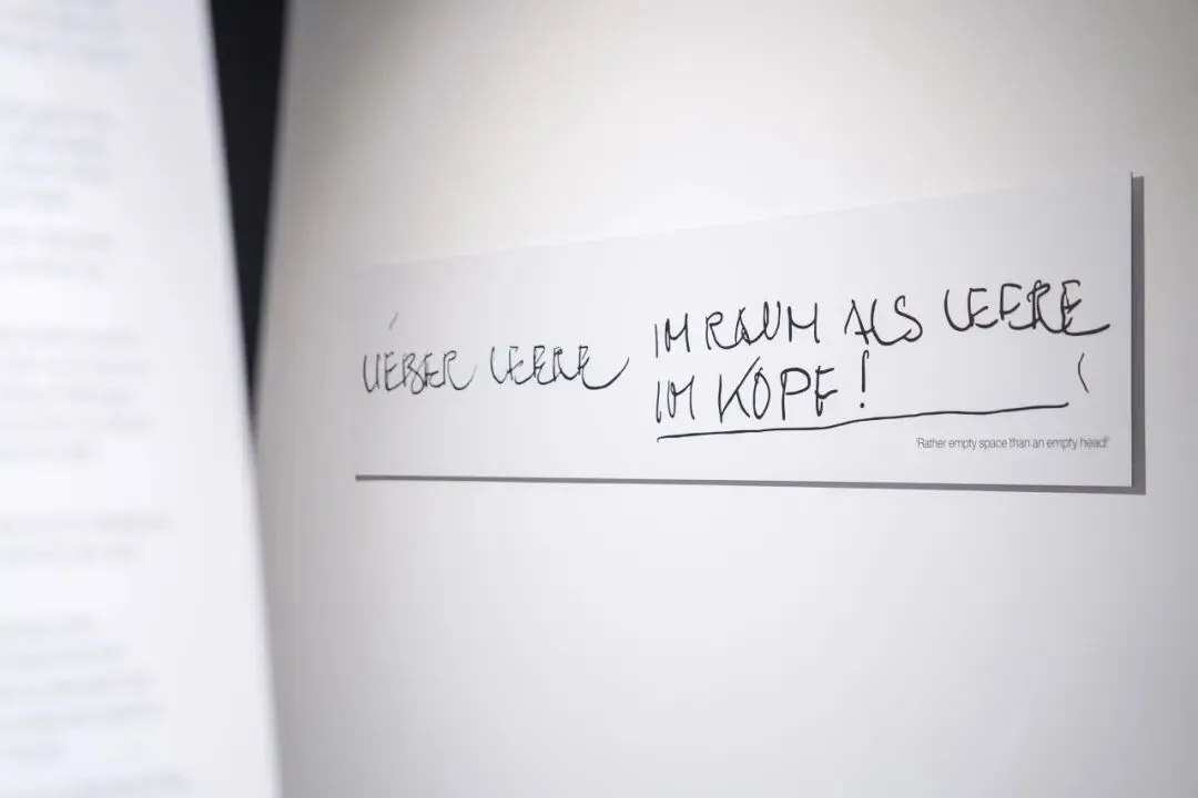 “Rather than empty space than an empty head.” 展览入口,迪特·拉姆斯以亲笔书法回应这个时代:当一切被不断填满,设计的意义恰恰在于留下思考的空间。