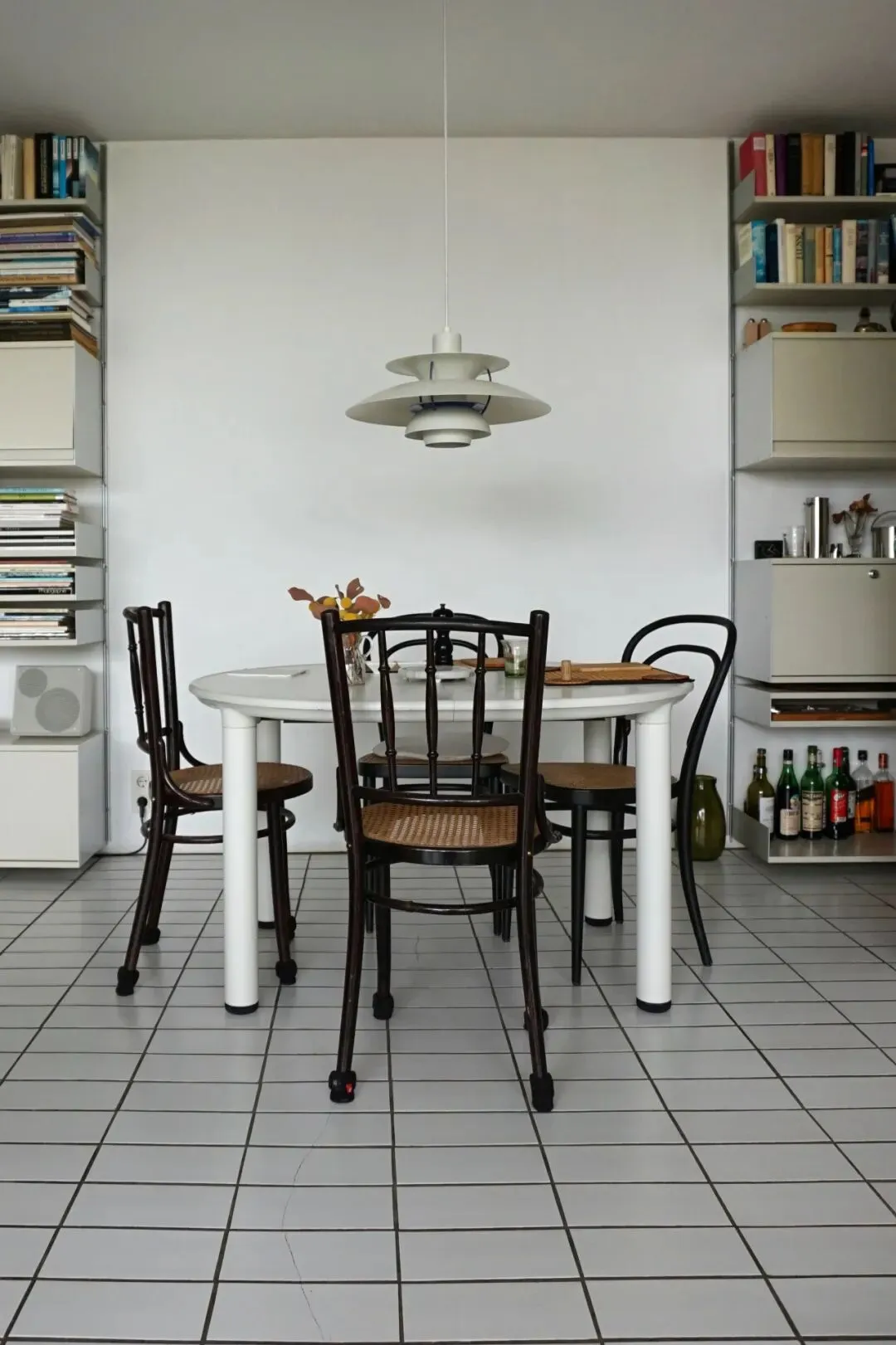 拉姆斯宅邸餐厅背景墙上的维索606通用搁架系统,