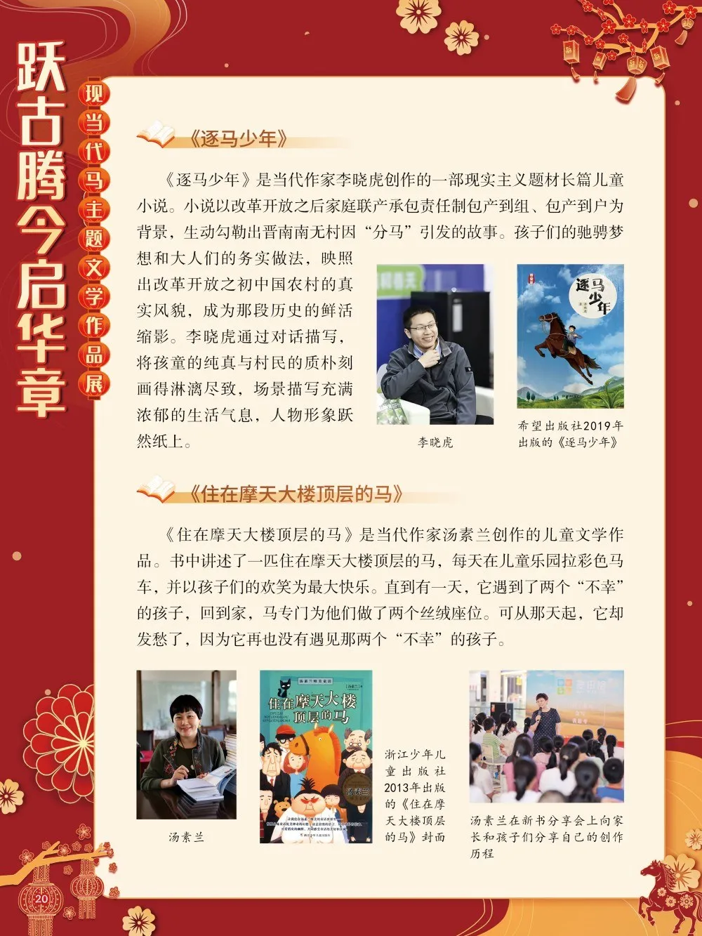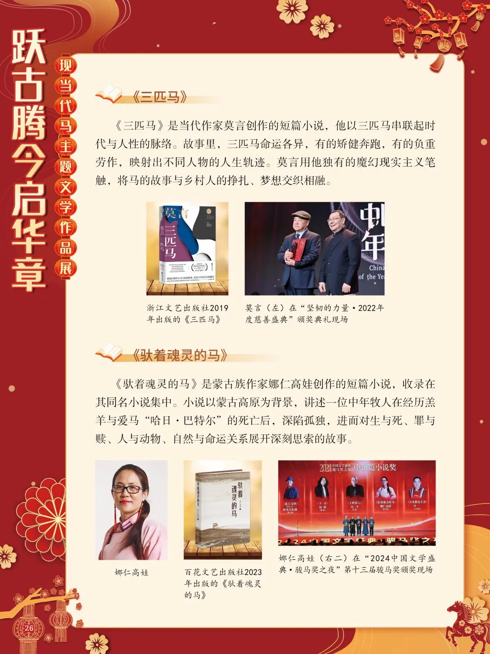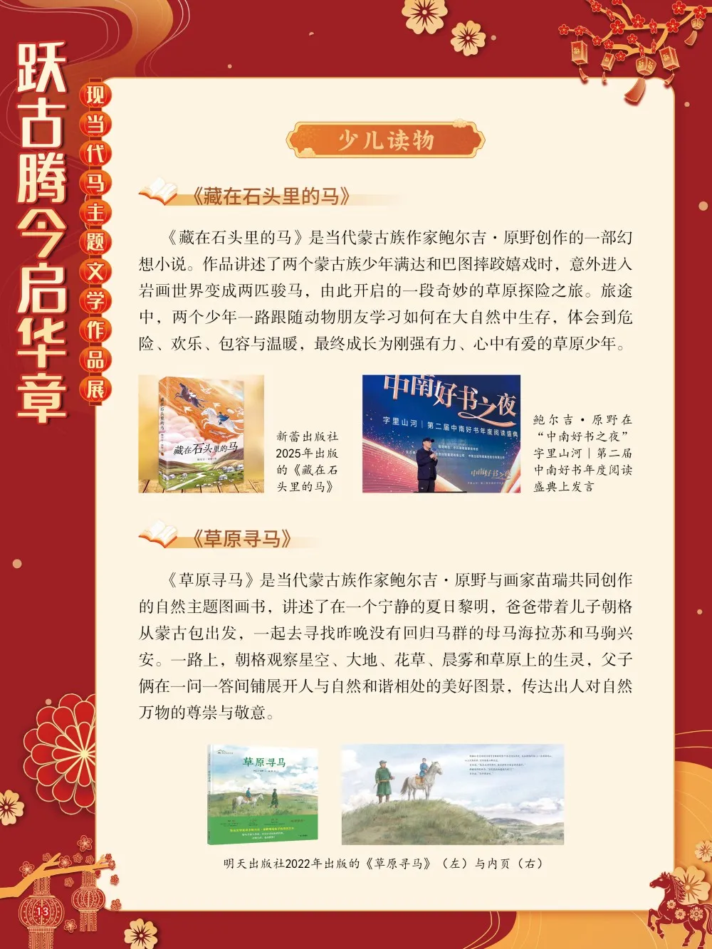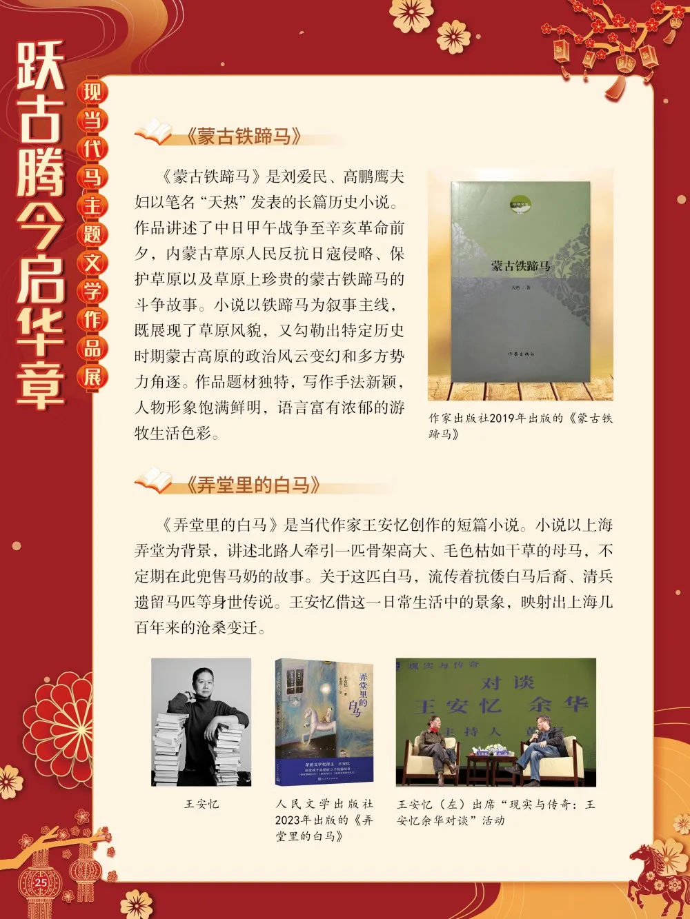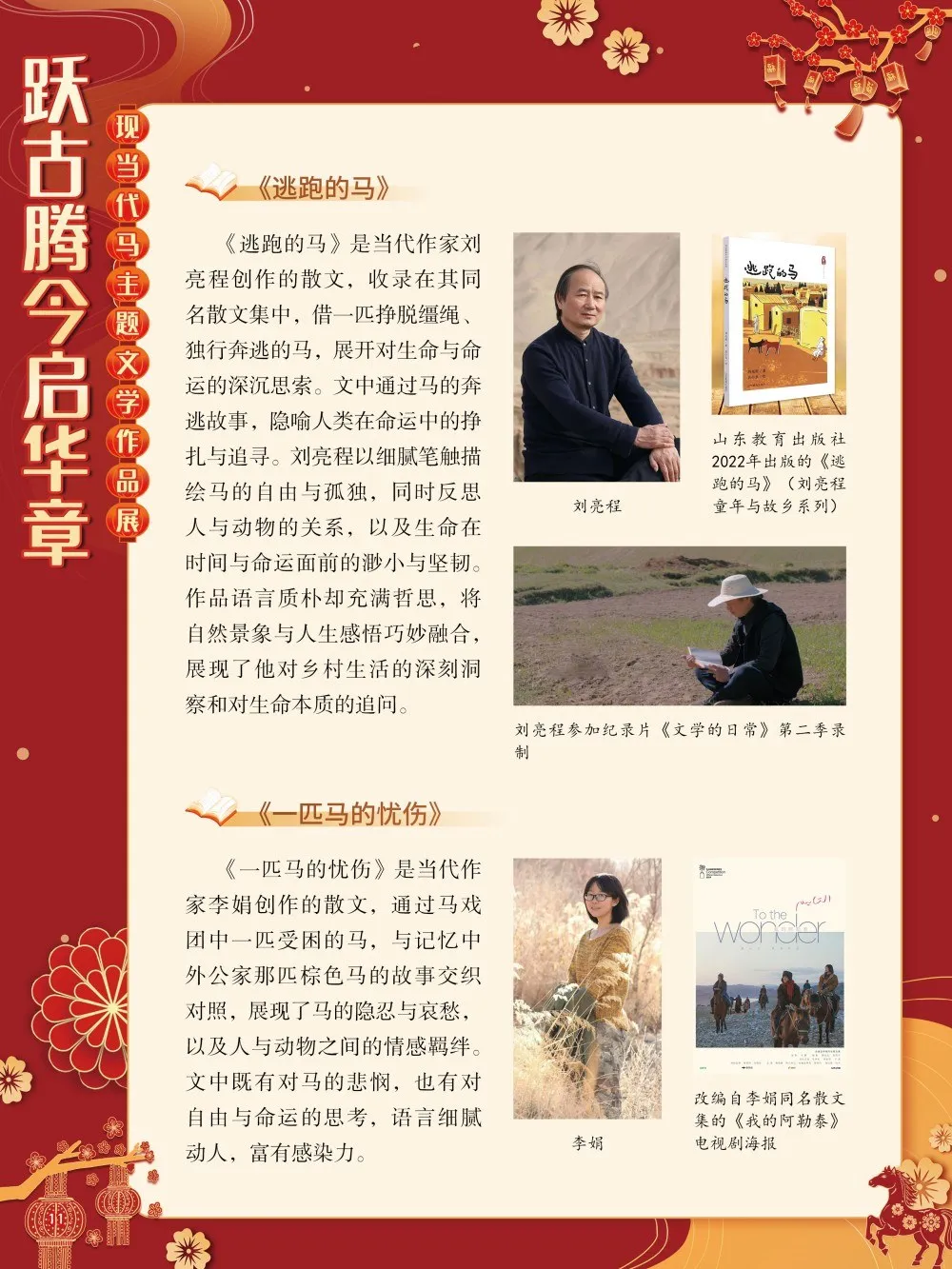在现当代文学中,马的形象被赋予了更深层次的哲思与情感。它作为生命个体、精神图腾和情感载体,在广阔的文字世界里奔腾不息。“跃古腾今启华章——现当代马主题文学作品展”以马为线索,汇集现当代文学作品,带领大家一同走进这片文学的草原。愿马蹄的每一次腾跃,都能激发我们对生命的热爱与对自由的向往,引导我们感悟马的文化魅力,开启一段新的华彩篇章。