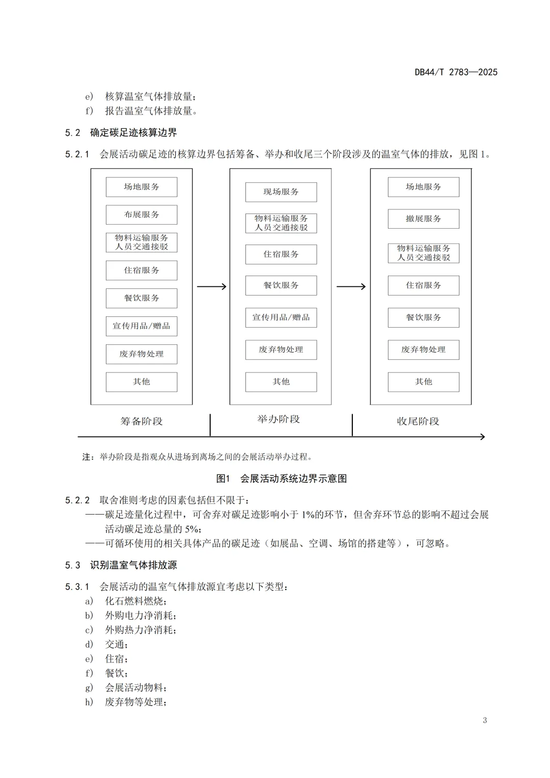 碳足迹核算作为指南的核心内容,流程清晰规范,涵盖确定核算边界、识别排放源、收集活动数据、选择排放因子、核算排放量及报告结果六个环节。核算边界包括会展活动的筹备、举办和收尾三个阶段,需综合考虑各阶段的排放影响,同时遵循“对碳足迹影响小于1%的环节可舍弃,但总舍弃影响不超过5%”的取舍准则。排放源识别需覆盖化石燃料燃烧、外购电力热力、交通、住宿、餐饮、物料及废弃物处理等类型,确保无重要排放环节遗漏。