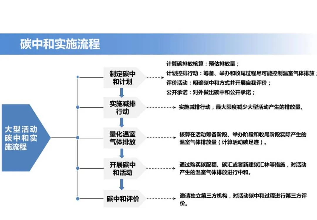 在碳中和实施方面,指南提出了从制定计划到确认实现的完整路径。会展活动组织者需在筹备阶段制定碳中和实施计划,明确核算边界、减排措施及碳抵消方式,并通过媒介向社会发布。