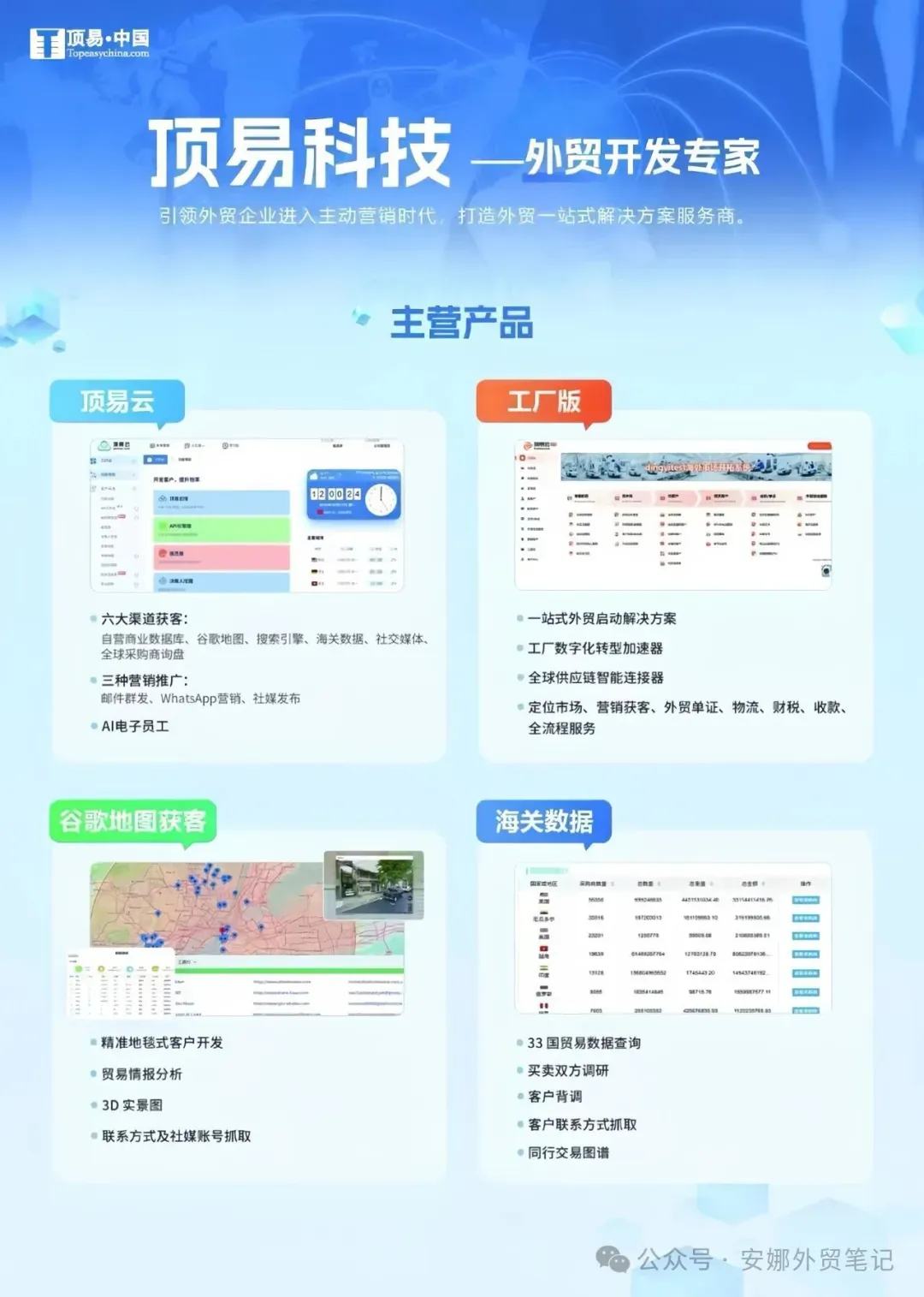海关数据:查询33国进口数据+27国出口数据,轻松查询目标市场进出口情况、竞争对手信息、产品趋势等,助你精准定位市场,一键获取邮箱、电话等联系方式,直接触达决策层,大幅提升成交率!试用地址
