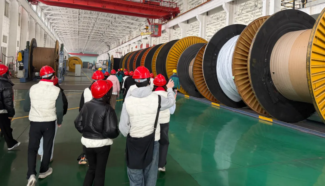 同学们实地了解了企业的发展历程,参观了智能化生产车间,近距离见证了电线电缆从铜杆加工、拉丝、绕包、绝缘到装圈入库的全自动化生产流程。同学们还在高压电缆生产车间看到了即将出口的装箱电缆。