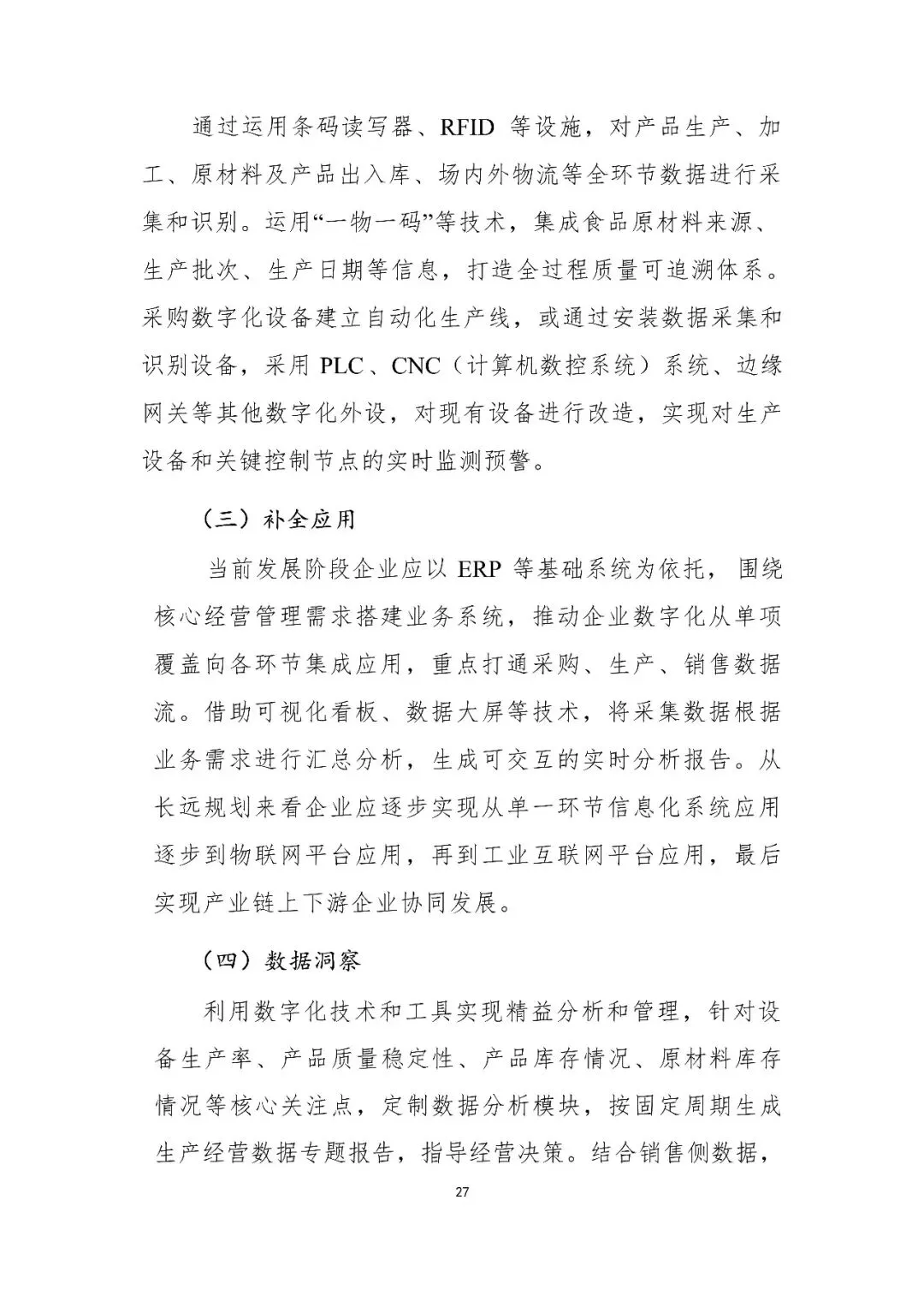 | 农副食品加工业 | 2. 生产计划与执行协同(ERP/APS/MES) 3. 全过程质量管控与追溯(QMS,一物一码) 4. 供应链协同 | 路径 保障:企业需制定转型方案并加大投入;行业统一追溯标准。 | |