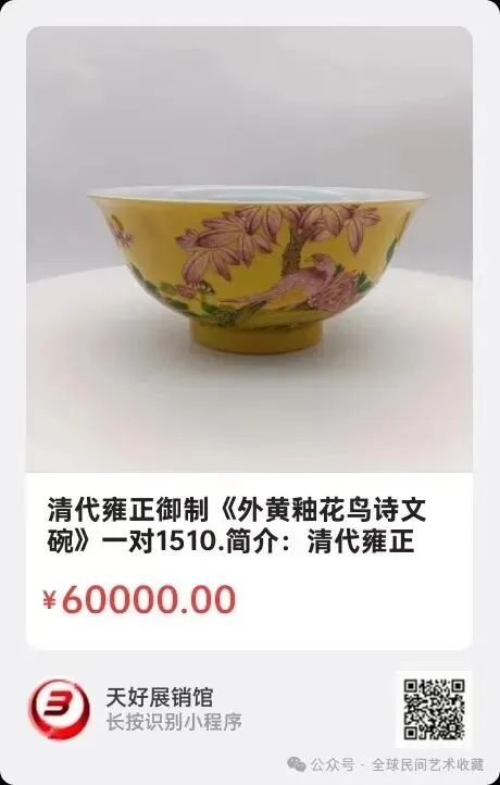 清代雍正御制《外黄釉花鸟诗文碗》一对,高6.8㎝,口径15㎝,圈足径6.5㎝。简介:清代雍正御制黄釉地花乌纹诗文碗一对,粉彩花乌图,配诗“秀擢三秋?,奇分五色葩”!此碗瓷胎质地细腻,红綠黑色着绘黄色地突显沉着高雅,很有韵味。此件留存应用痕迹,具有较高的历史沧桑与文化价值。来源1510.V.