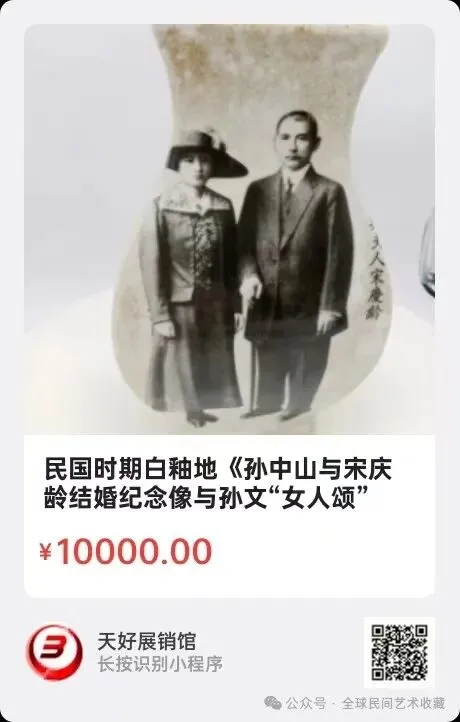 民国时期白釉地《孙中山与宋庆龄结婚纪念像与孙文“女人颂”诗词方尊》。高20㎝,口径9.2x6.2㎝,底足8.3X6.2㎝。简介:以上白釉细开片《孙中山与宋庆龄结婚纪念诗文方尊》是民国时期1915年10月25日孙中山与宋庆龄伉俪情深,结婚照像题诗文烧制的陶瓷纪念品。方尊正面为二人结婚纪念黑色釉画立像,背束腰部孙文送贤妻诗词“精诚无间,同忧乐,笃愛有缘,共死生”,腹部孙中山为夫人所写诗文《女人颂》。据说在日本,宋庆龄阅此诗文后感动的落泪。作者籍结婚纪念日向夫人表达了世间对伟大女性的热爱和歌颂。反映了人世间愛的真谛!来源1510.V.