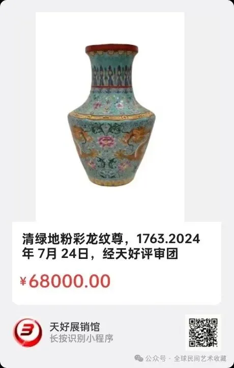 清绿地粉彩龙纹尊,器型规整,画工精致,彰显皇家气势,老化痕迹明显,底足书写“大清乾隆年制”青花篆书款”,器型高40.5公分,口径14.5公分,底足15公分。2024年 7月 24日,经天好评审团评审,以6票优势荣登精品榜,获第136期天好海选精品。来源1763.V.