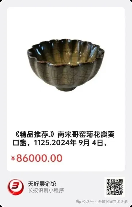 南宋哥窑菊花瓣葵口盏,此菊花瓣葵口盏造型秀雅,共有15瓣菊花折边葵口型,开片纹路错落有致,层次感极强,金丝铁线明显,釉面如堆脂,温润如玉,有着官窑紫口铁足的典型特征,属哥窑之珍品,不可多得,有极高的收藏价值。尺寸:口径9cmx高6cm。2024年 9月 4日,经天好评审团评审,以6票优势荣登精品榜,获第142期天好海选精品。来源1125.V.