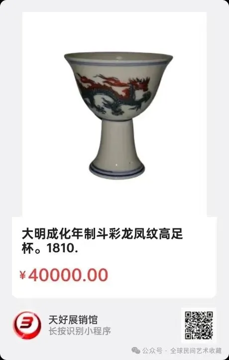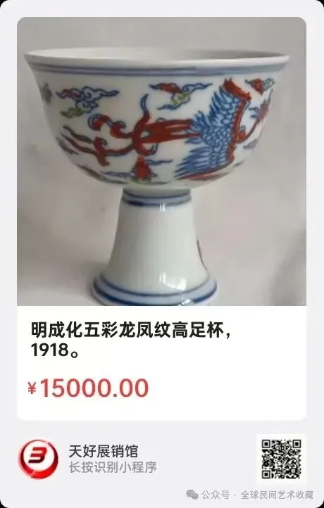 明成化五彩龙凤纹高足杯高8.5口径8.8底圈直径4.5公分。作为明代瓷器中的精品,具有极高的收藏价值,成化瓷器以小巧精致著称,胎质洁白细腻,釉质温润如玉,青花发色淡雅,纹饰线条纤细,符合“成窑一件衣”的审美特点,是工艺巅峰代表。来源1918。V.