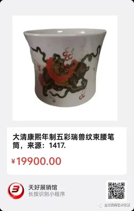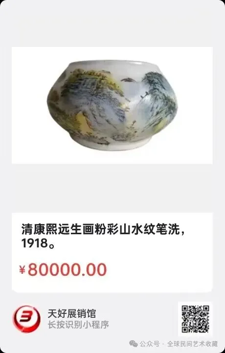 “清康熙远生画粉彩山水纹笔洗”,重量900克高9.5口径11腹径16.8底圈直径11.5公分标价;康熙青花山水笔筒曾拍出 20万元天价,“远生”款确为康熙本朝名家款,价值将大幅提升。康熙粉彩彩料柔和、胎质坚密,山水纹层次清晰;完整无损、纹饰精美的笔洗价值更高,大尺寸器物更稀缺。确认为康熙本朝“远生”款真品,且品相上乘,其收藏价值可能达 数十万元。来源1918。V.