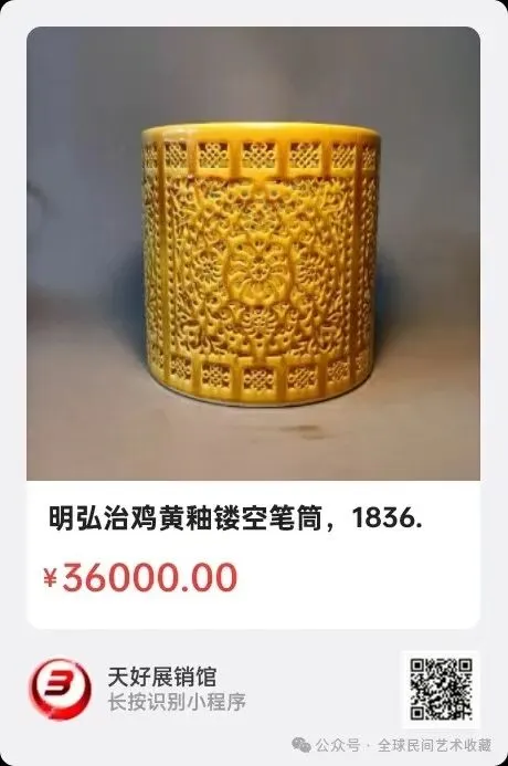 明弘治鸡黄釉镂空笔筒,高20cm,口20cm,底20cm,来源1836.